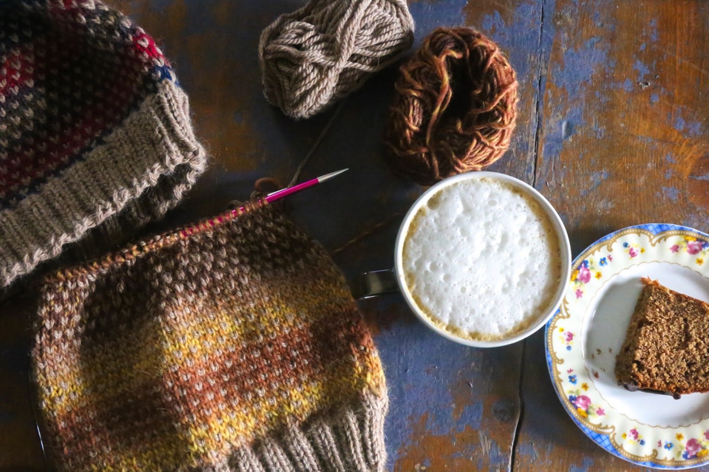 A colour-changing hat, with odd-stitched dots, made with Aran weight wool on 4mm and 5mm circular needles.